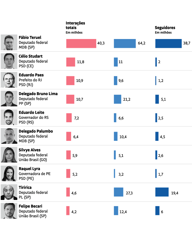 Apesar disso, ele aparece como um dos parlamentares de centro com melhor desempenho por post: 3.624 interações, em média. Já Davi Alcolumbre (União Brasil-AP), presidente do Senado, com 627 mil seguidores, registra 1.129 interações por publicação.